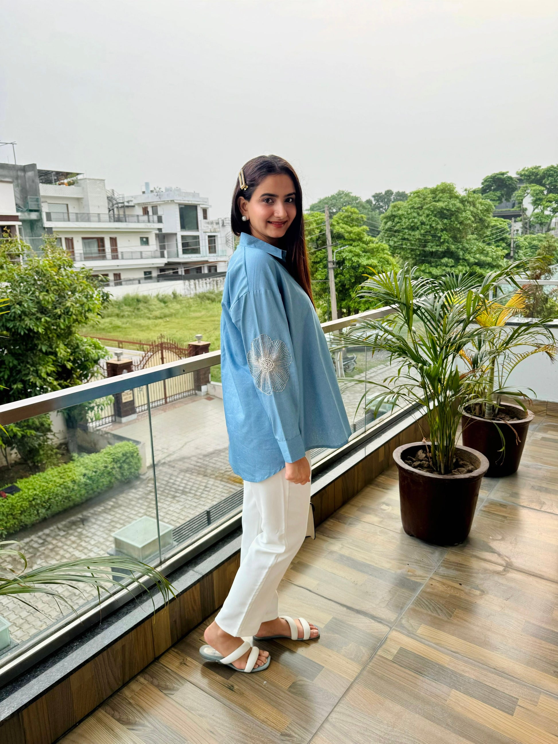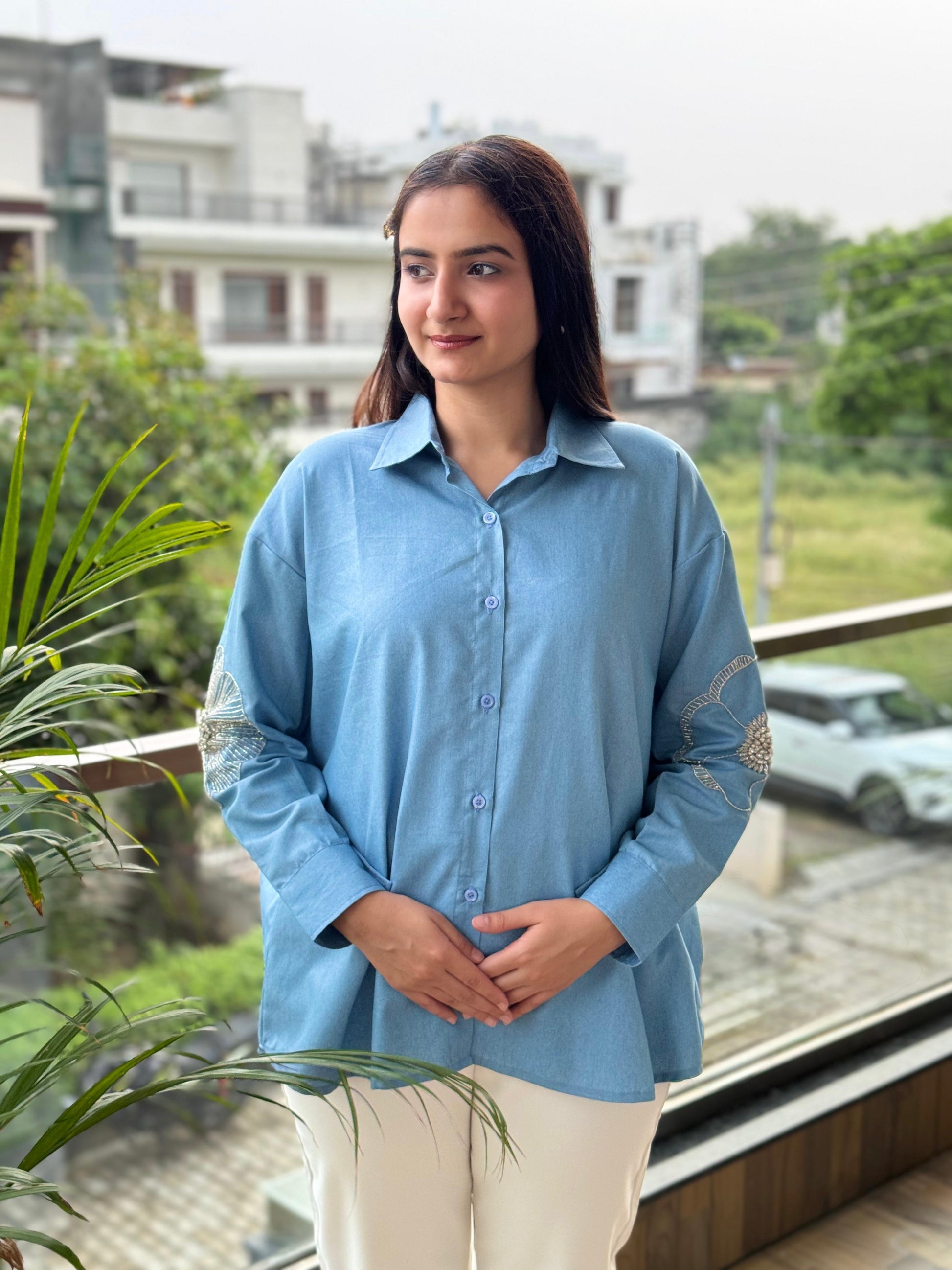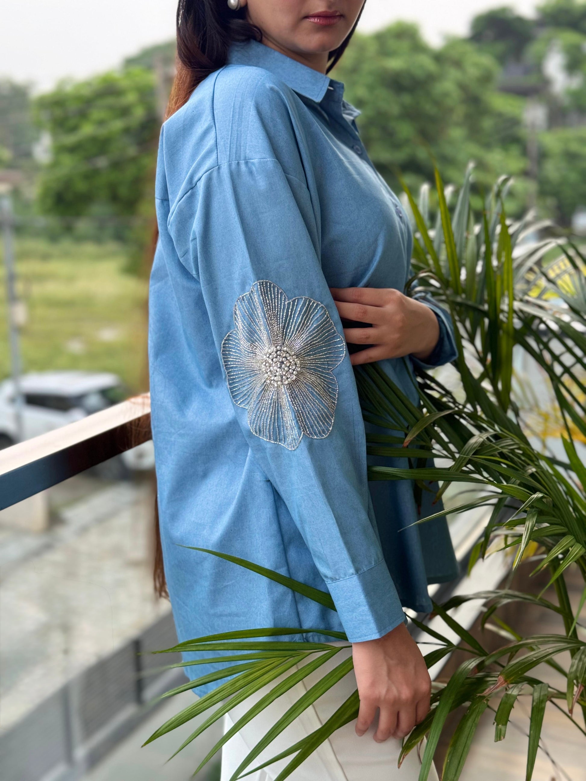Step into effortless elegance with this crystal flora button-down shirt—an ideal blend of comfort and sophistication. Crafted from a soft, breathable denim cotton blend, this piece features a relaxed, oversized silhouette perfect for everyday ease. The true standout? Intricately hand-embroidered floral motifs on the sleeves, adorned with pearlescent beading that adds a refined yet playful touch.