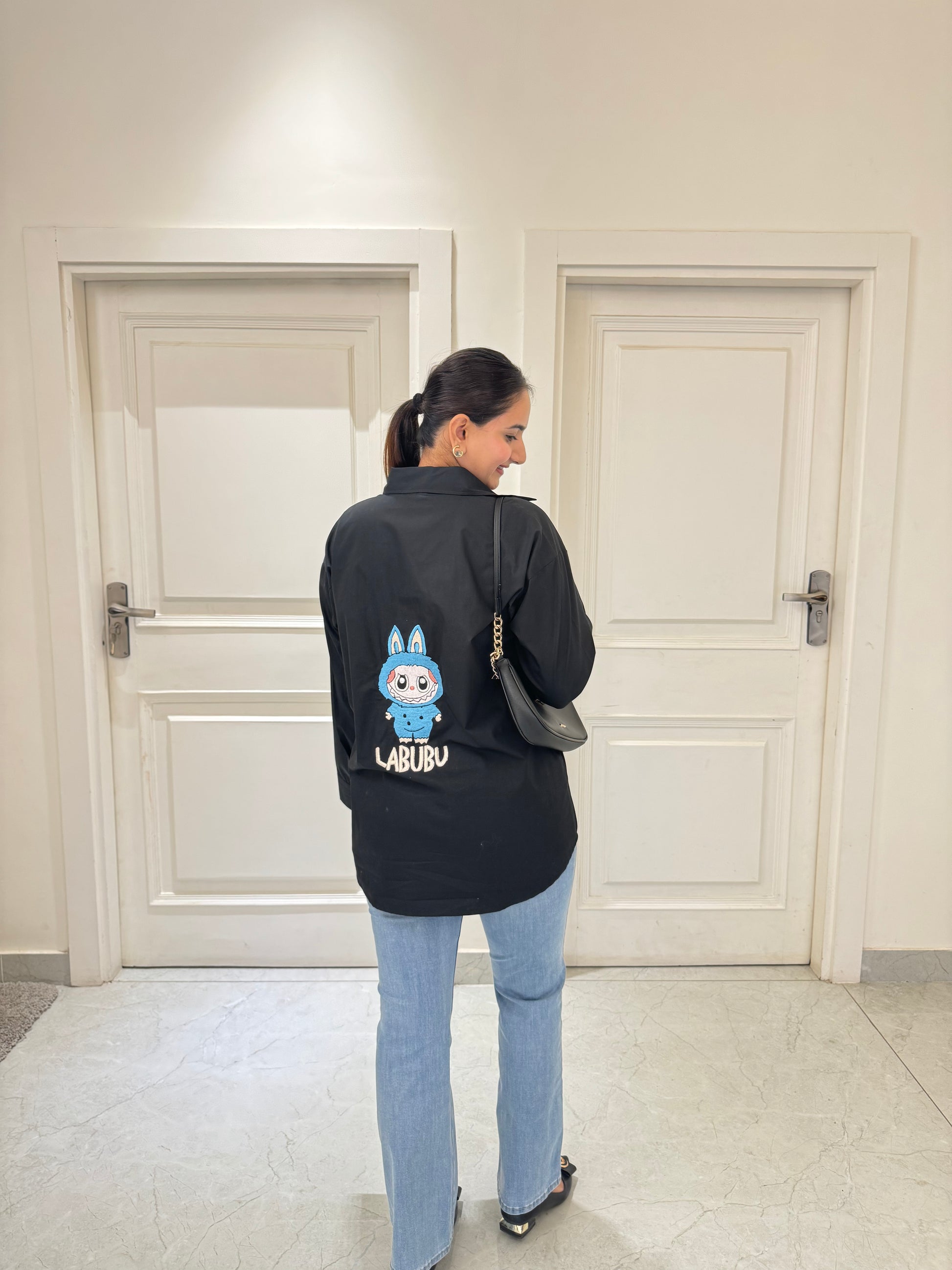 Add a dash of playful charm to your casual collection with the Labubu Charm Oversized Shirt — a relaxed-fit black shirt featuring an adorable embroidered Labubu character on the back. Crafted from soft, breathable cotton fabric, this shirt balances comfort with quirky flair. Its minimalist front keeps it classic, while the detailed cartoon patch on the back adds a bold twist, perfect for fashion lovers with a fun streak.