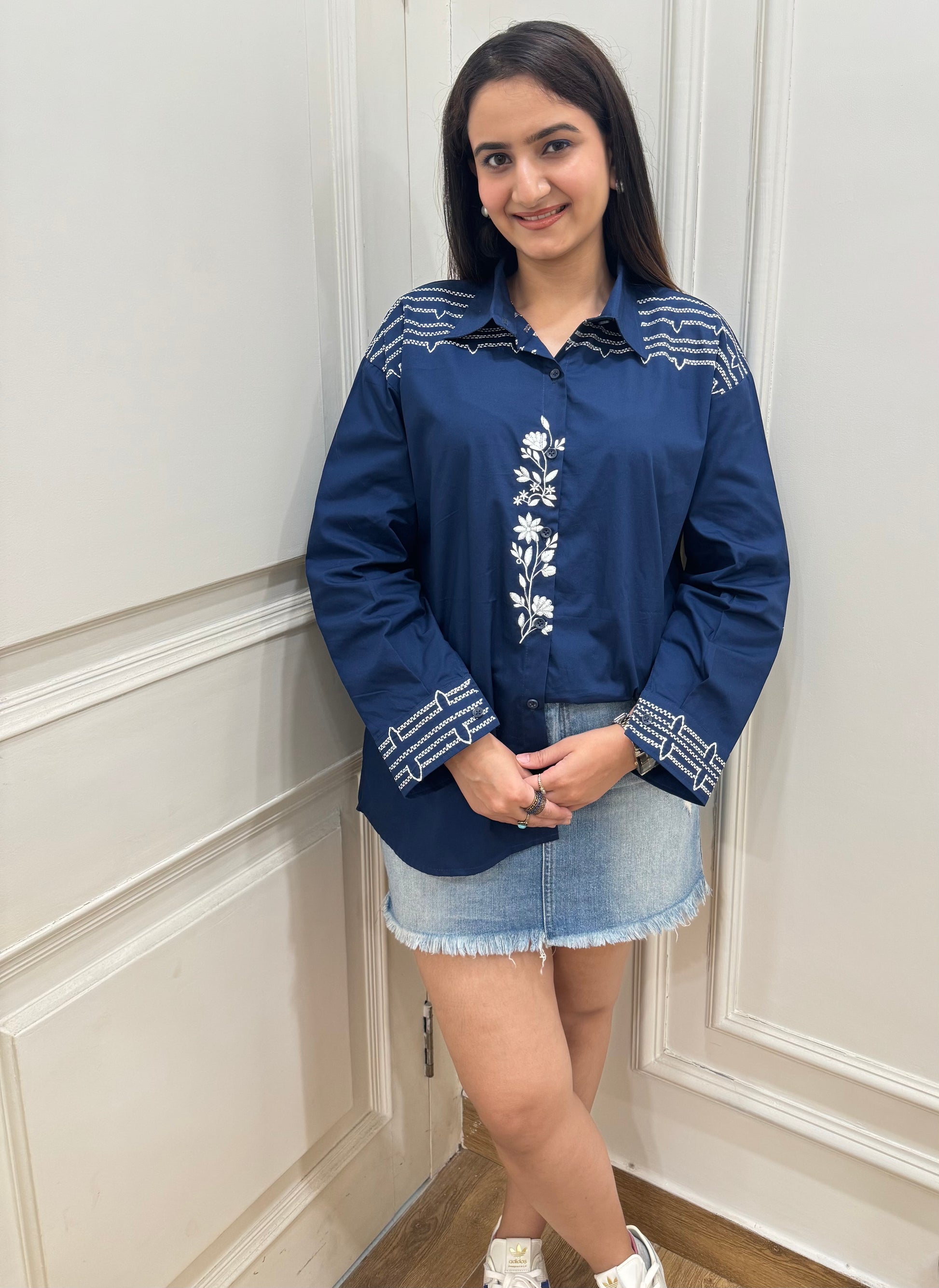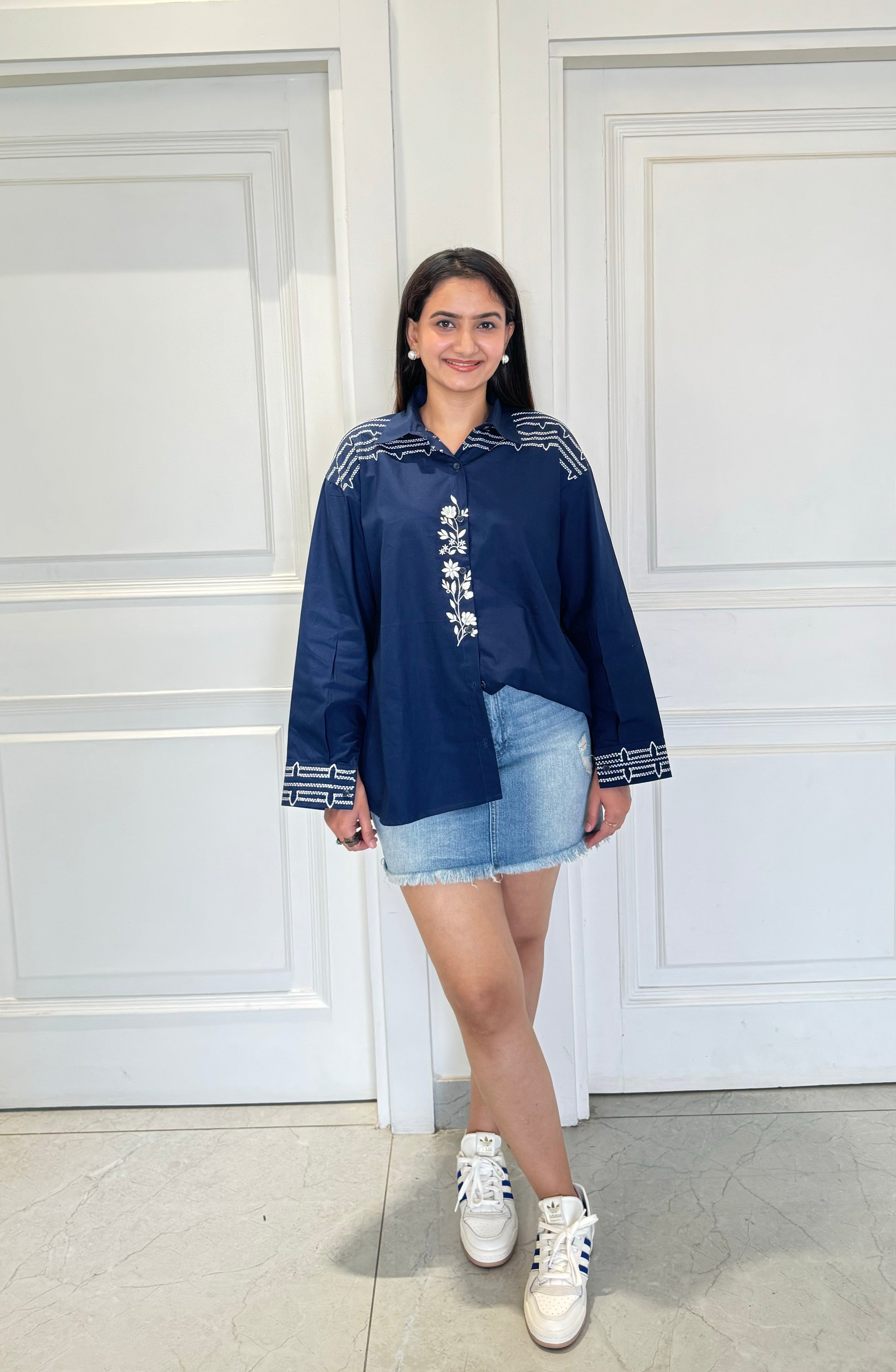 Refresh your wardrobe with this elegant Midnight Bloom Embroidered Shirt — a versatile navy button-down with artisanal charm. Crafted from soft, breathable cotton fabric, this statement piece features an easygoing silhouette that flatters while offering all-day comfort. White floral embroidery down the front and intricate threadwork along the shoulders and cuffs lend it a handcrafted sophistication perfect for dressing up or down.