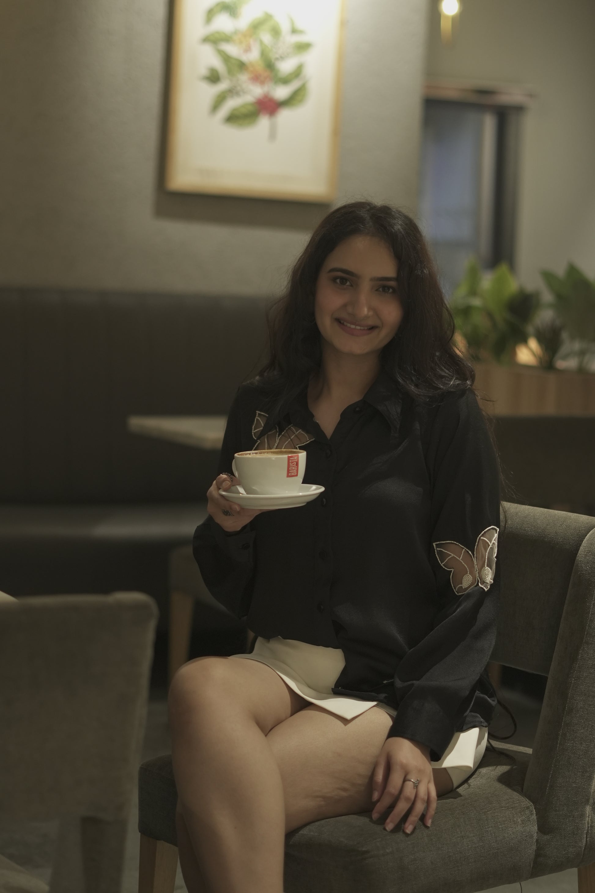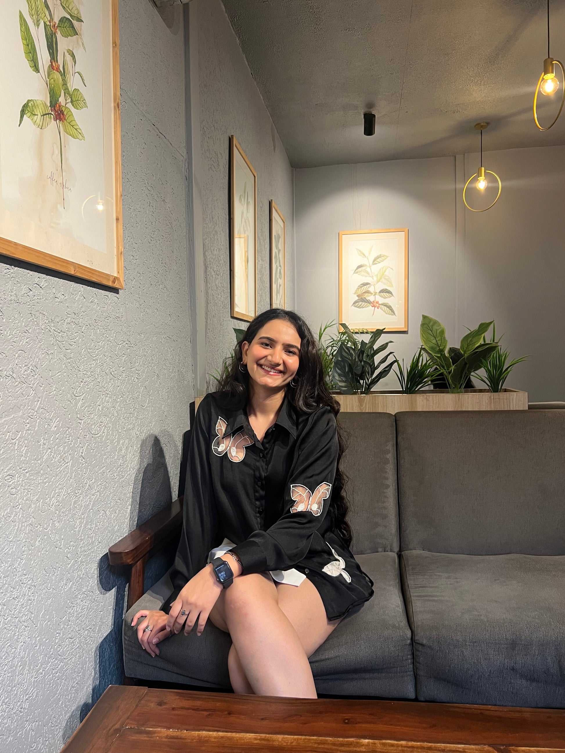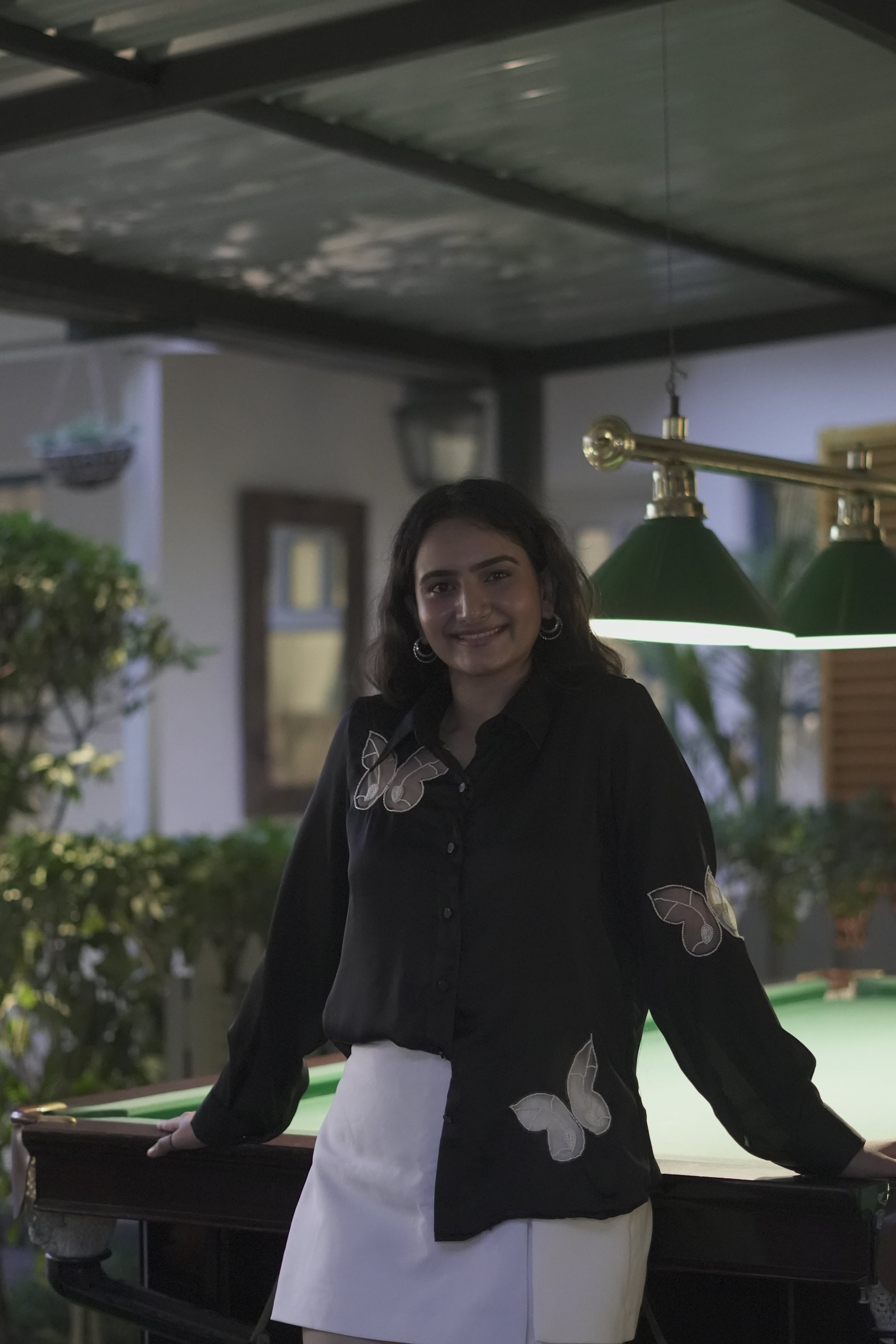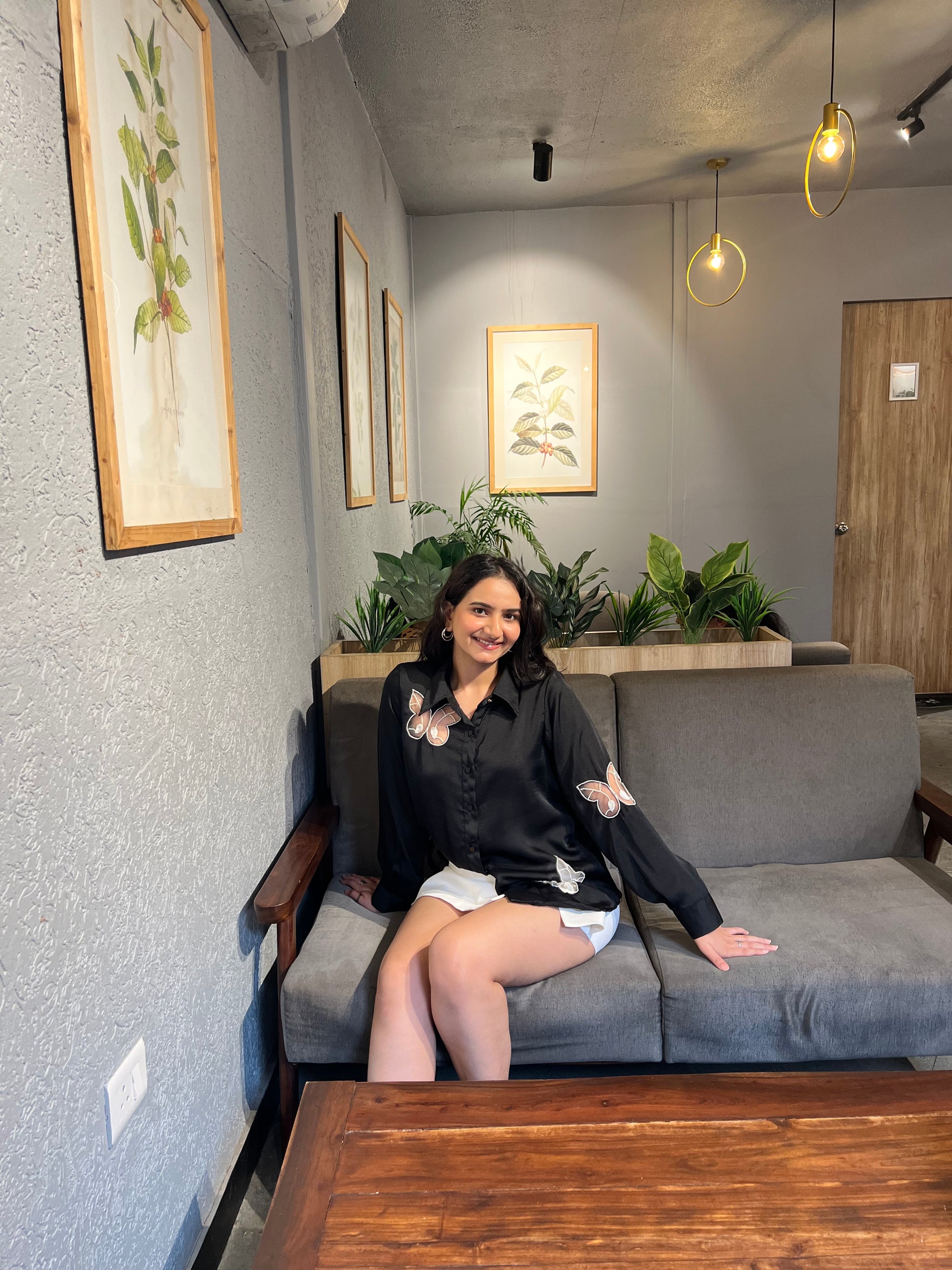 Add a touch of elegance and whimsy to your wardrobe with our Midnight Butterfly Embroidered Shirt. Crafted from a smooth Mini silk fabric with a subtle sheen, this black button-down shirt features delicately embroidered butterflies on the front, sleeve, and hemline. The relaxed fit and soft drape make it as comfortable as it is stylish, ideal for both casual and semi-formal occasions.