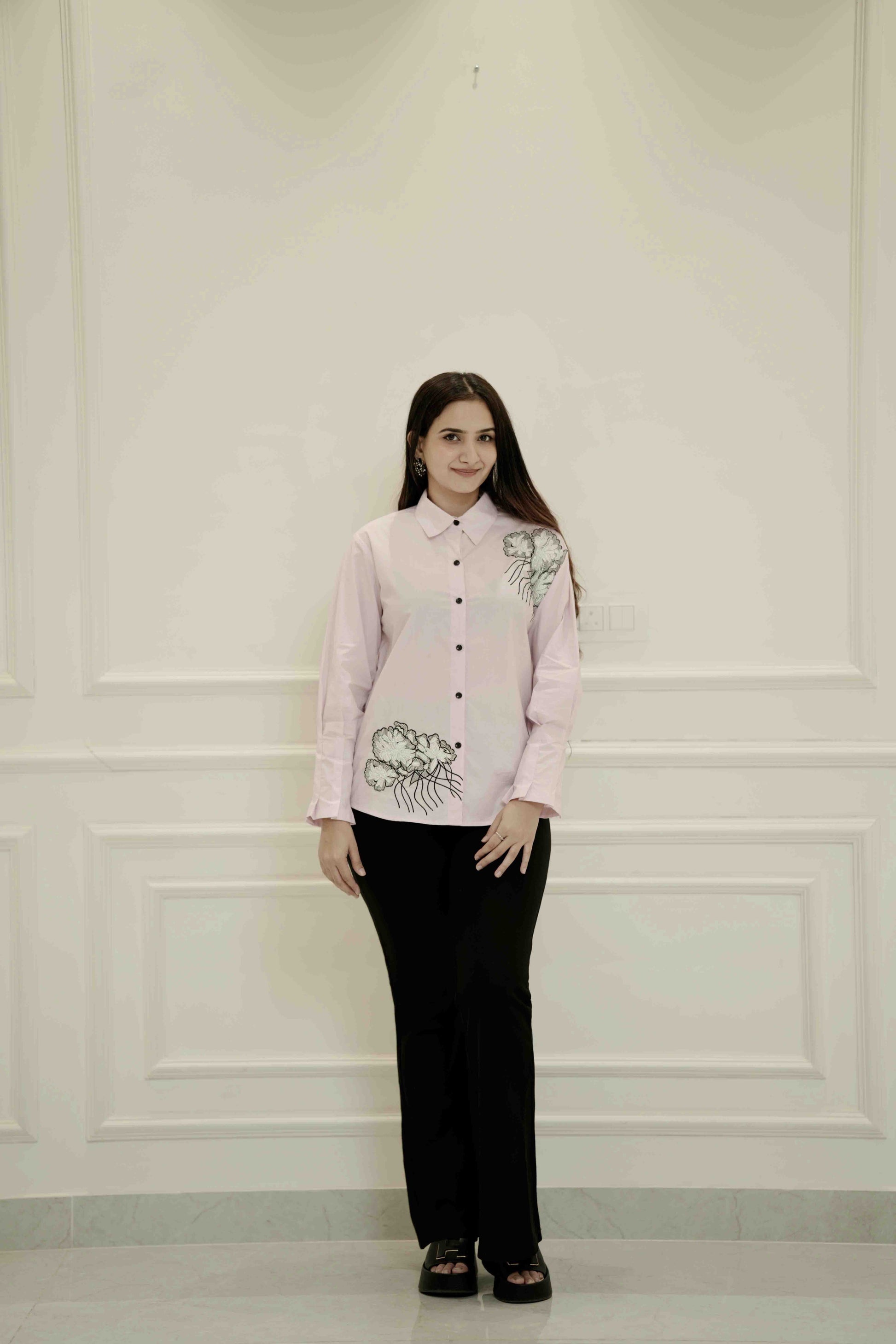 Elevate your everyday elegance with our Petal Whisper Embroidered Shirt – where timeless charm meets contemporary grace. Crafted from soft, breathable cotton, this light pink button-down shirt features intricate black and white floral embroidery on the front shoulder and lower hem, adding an artistic touch to a classic silhouette.