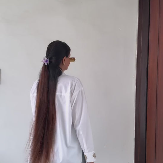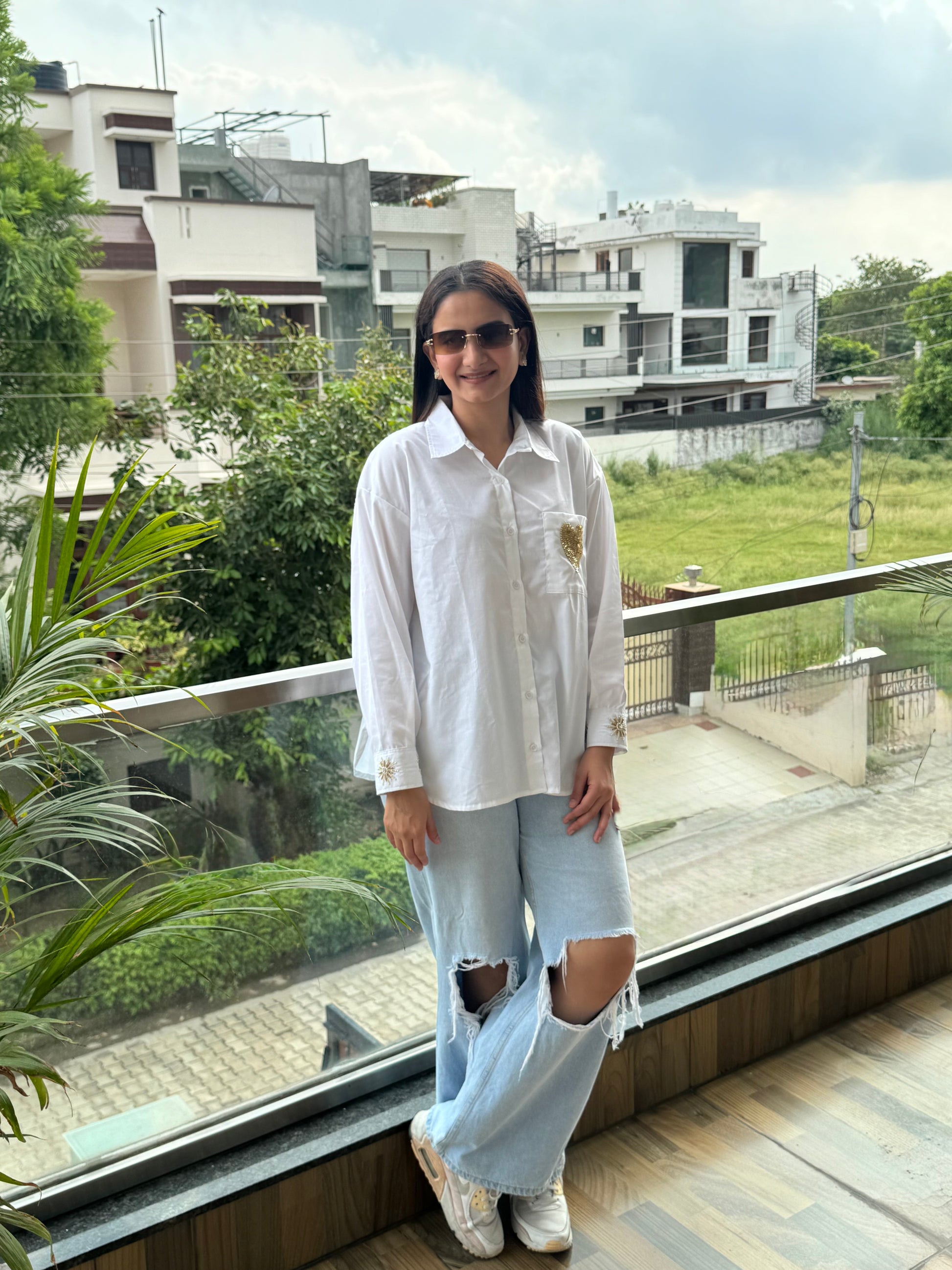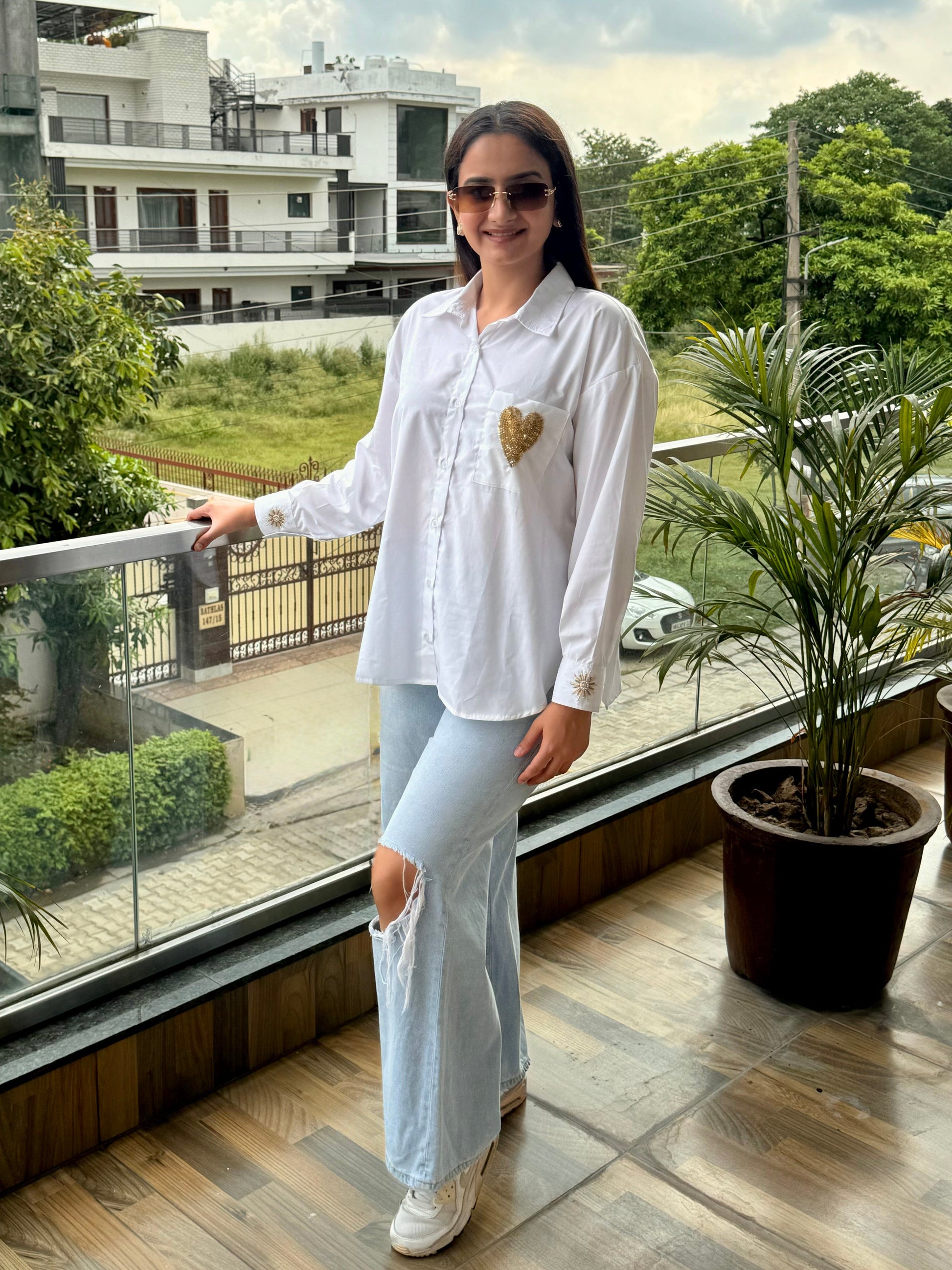 Elevate your casual style with this charming Golden Heart Embroidered Shirt, a classic white button-down with a playful, elegant twist. Crafted from breathable cotton fabric, this piece features a relaxed fit perfect for all-day comfort. A dazzling gold sequin heart detail on the chest pocket adds personality and flair, while delicate sunburst embroidery at the cuffs brings subtle sophistication.